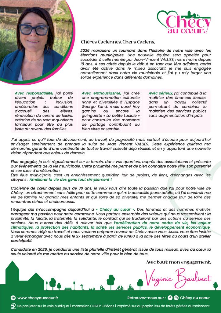 Candidate aux élections municipales de 2026, Virginie BAULINET a su s'entourer d'une équipe portant les mêmes valeurs et qui s'engage autour d'elle pour faire battre le cœur de Chécy.